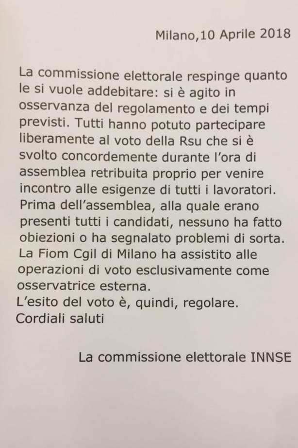 10 aprile La commissione Elettorale INNSE ha così risposto