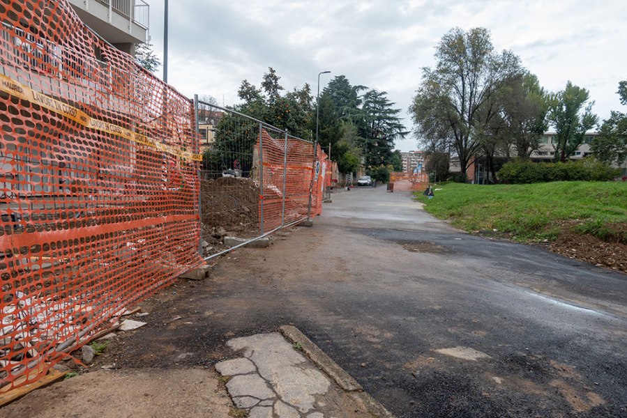 Il cantiere che invade la sede della strada che termina in via Monfalcone