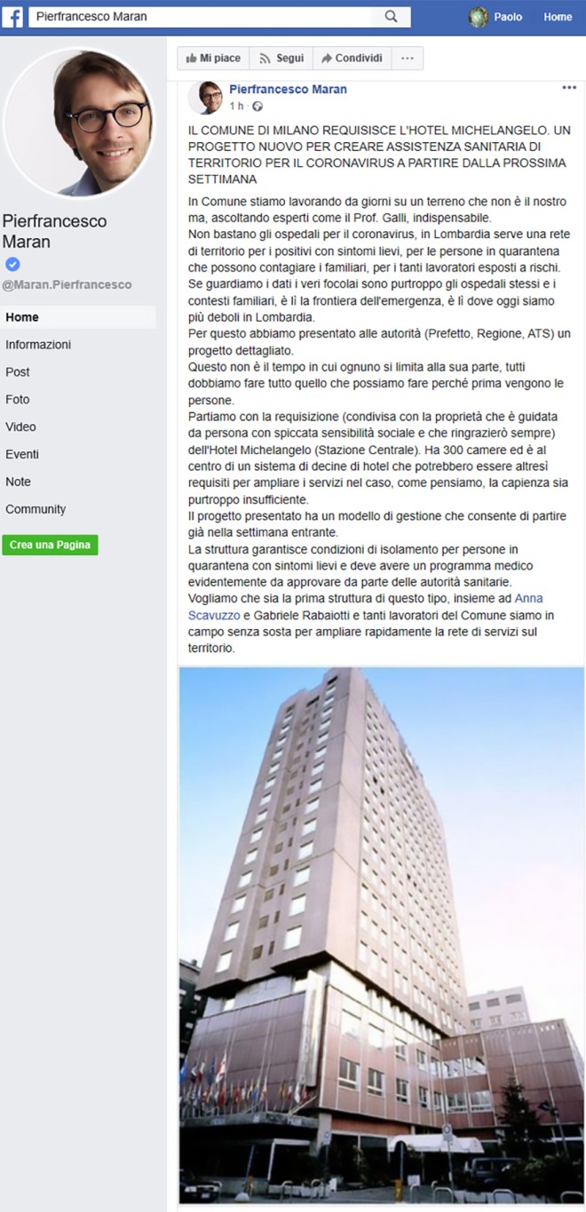 Sulla pagina Facebook di Pierfrancesco Maran, assessore Comune di Milano, viene detto che la requisizione di un albergo è una pensata geniale del Comune; viene ringraziato il proprietario dell’albergo requisito; non viene detto qual’è l’entità dell’indennizzo pattuito; in compenso …