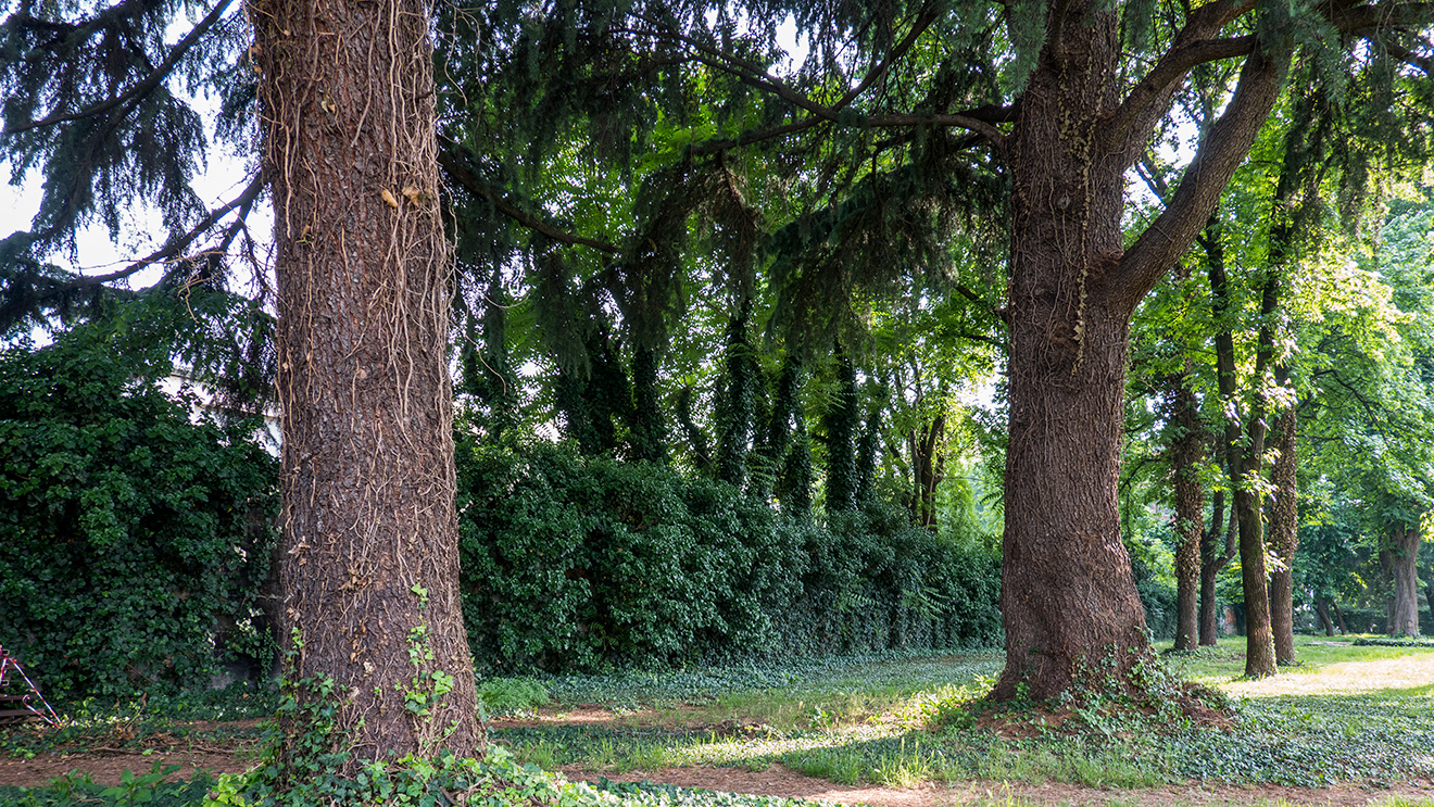 Il filare di pini e il muro che delimita la proprietà pubblica? da quella privata.