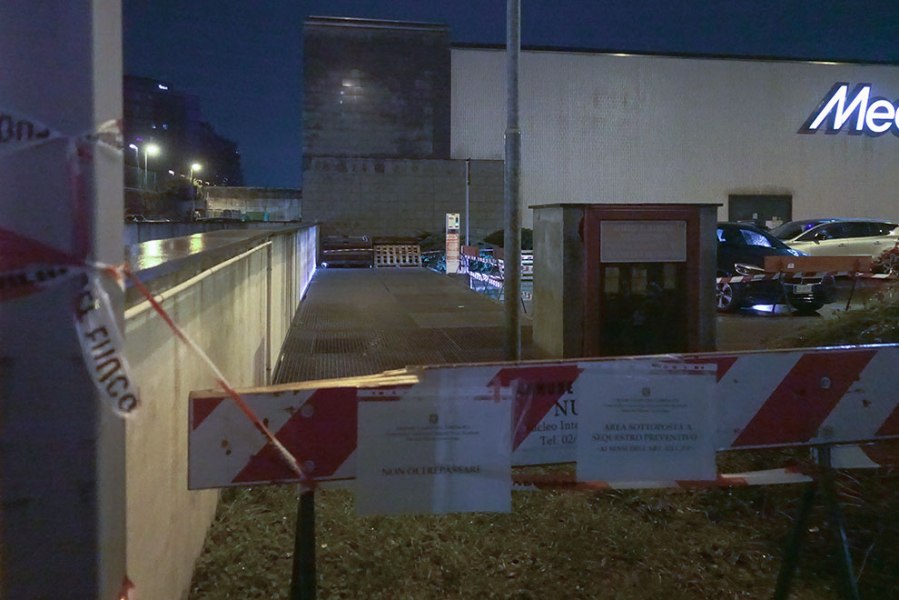 Via Caduti di Marcinelle. A sinistra vi è il muretto che delimita la discesa al parcheggio sotterraneo. di fronte vi è l’area transennata con le grate di areazione che arrivano sino al muro di MediaWord. I due uomini erano sull’ultima grata. Quella ora caduta e schermata da un palet.