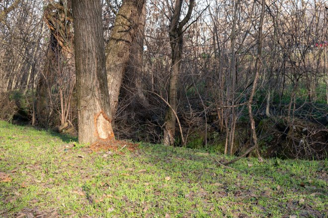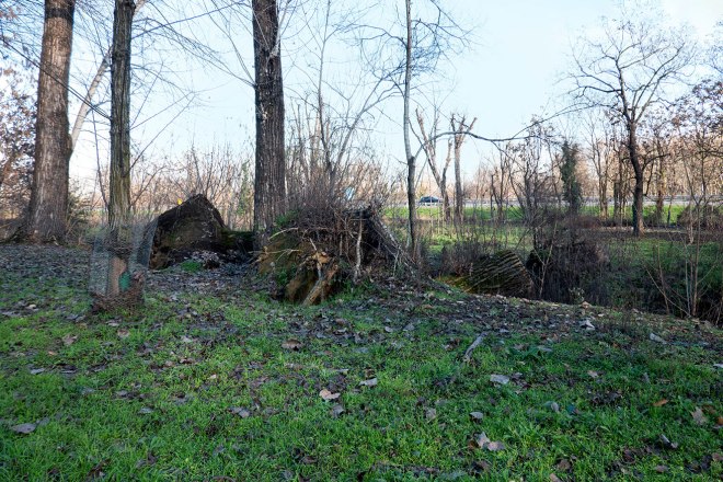 Elena Grandi è stata di parola: molti alberi, i più grandi ma non solo, sono circondati dalla rete; altri sono “i vecchi decorticati sopravvissuti”; ma ancora molti sono senza rete. E le nutri ci sono ancora.