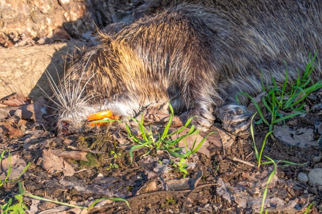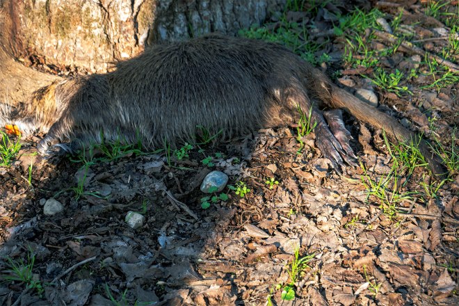 Vicino ad un albero, senza rete, leggermente decorticato, abbiamo trovato una nutria: morta.