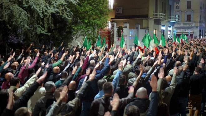 Ai neofascisti per i saluti romani al corteo in memoria di Sergio Ramelli a Milano del 29 aprile 2018. I giudici della terza sezione penale del Tribunale di Milano hanno condannato 13 esponenti, fra cui alcuni nomi noti di Forza Nuova, Casapound e Lealtà e Azione, a 4 mesi di pena per violazione della legge Mancino e della legge Scelba per incitamento alla discriminazione o alla violenza per motivi razziali. Sei i recidivi per i quali non verrà applicata la sospensione condizionale della pena. La manifestazione non autorizzata di quell’anno vide la partecipazione di circa 2mila persone, riunite per commemorare, come quasi ogni 29 aprile, Sergio Ramelli, il 18enne del Fronte della Gioventù ucciso nel 1975 da un gruppo di militanti di Avanguardia Operaia.”
