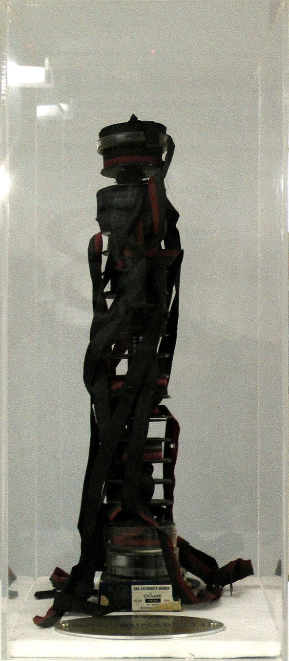 enzo-minarelli-totem-1980-2009-cm-50×22-con-copertura-in-parallelepipedo-di-plexiglass-rulli-e-nastri-da-macchia-da-scrivere