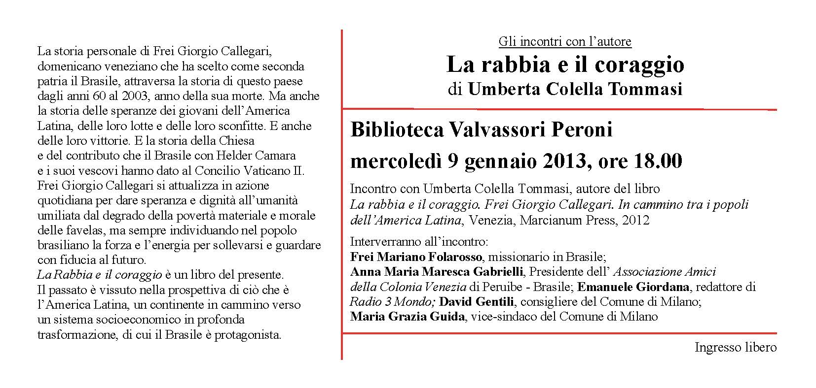 La rabbia e il coraggio : Frei Giorgio Callegari in cammino tra i popoli dell’America latina / Umberta Colella Tommasi. – Venezia : Marcinum press, 2012. – 330 p. ; 21 cm. è ammesso al prestito presso la biblioteca. Collocazione: VAL.266.COLE