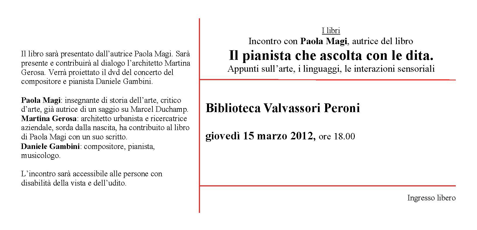 Il pianista che ascolta con le dita : appunti sull’arte, i linguaggi, le interazioni sensoriali / Paola Magi. – Milano : Edizioni Archivio Dedalus e AccaparlantEdizioni, 2010. – 218 p. : ill. ; 21 cm + 1 DVD. è ammesso al prestito presso la biblioteca. Collocazione: VAL.759.06.MAGI