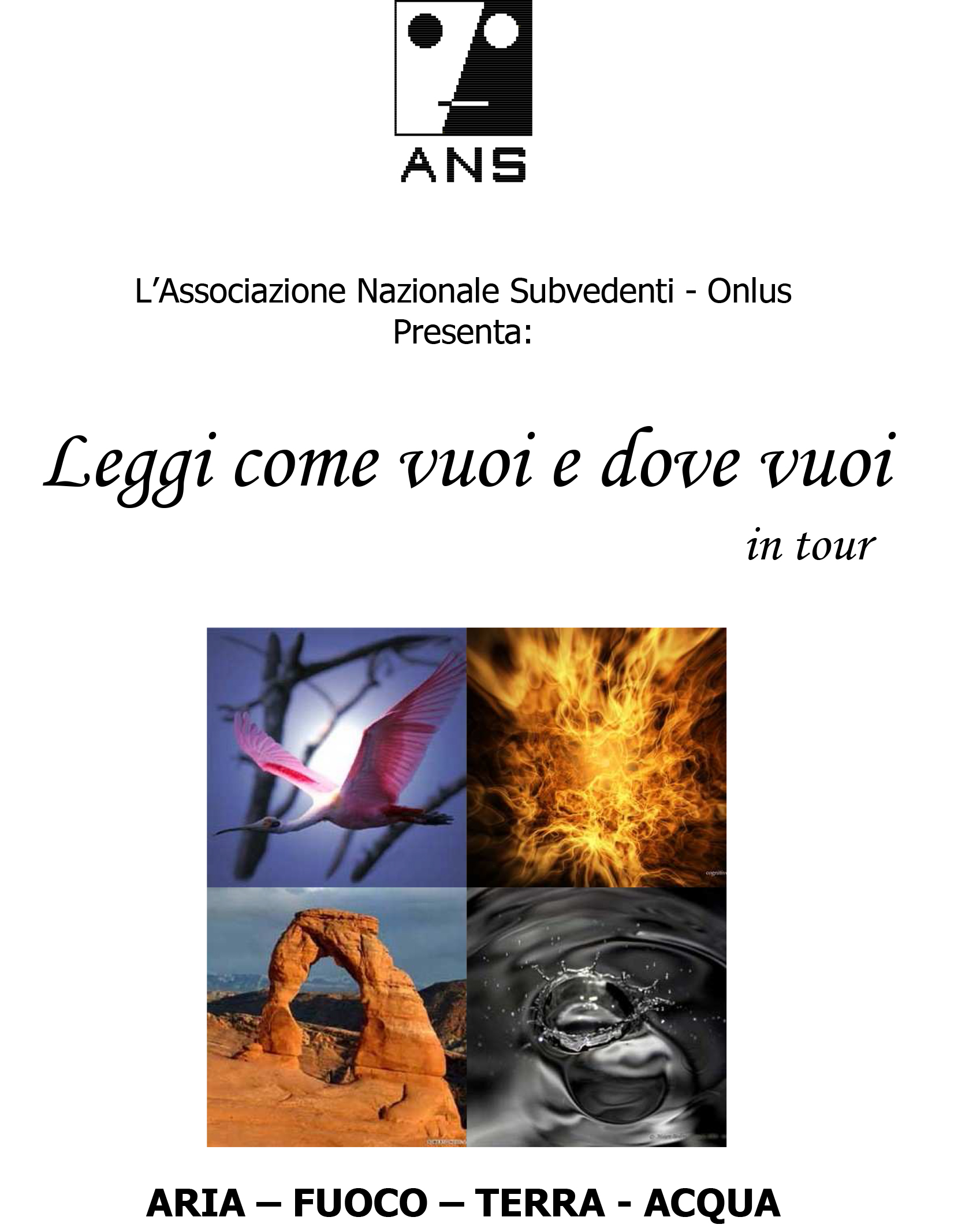 Il tema conduttore del tour sono stati i quattro elementi della natura: terra, acqua,fuoco, aria. Dapprima è stato privilegiato, ad ogni incontro, un elemento. L’ultimo incontro li ha considerati tutti.