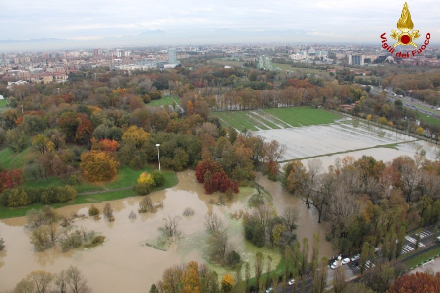 Veduta della cava inondata in primo piano, sulla destra dei campi a maggese del parco e la Cascina Molino San Gregorio, oltre la quale c’è il Centro Ambrosiano Di Solidarieta’.