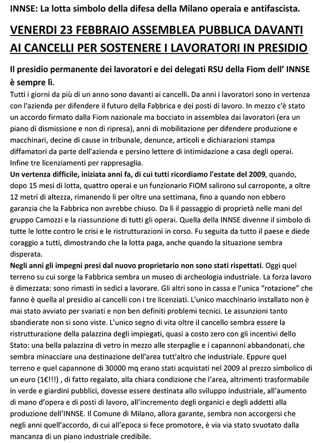 23 febbraio ASSEMBLEA DAVANTI AI CANCELLI DELLA INNSE: VIA RUBATTINO 81 ORE 11.00